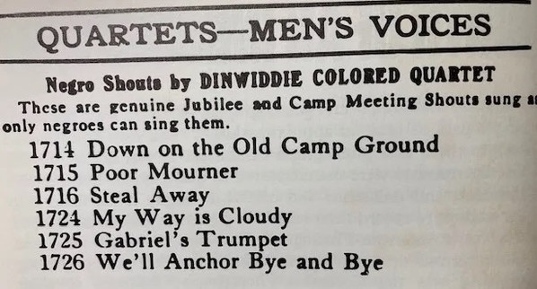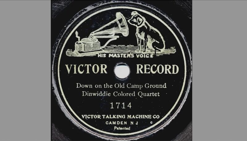 Les premiers enregistrements disponibles de spirituals sont également dus au Unique Quartet, probablement en novembre 1893 chez Edison, puis au Standard Quartet l’année suivante (mon article du 22 juillet 2024). Jusqu’à la fin de la décennie, les noms de ces deux formations, avec celui de George Washington Johnson, alors très populaire, reviennent le plus souvent dans les enregistrements d’alors. Mais le 29 octobre 1902, il y a tout juste 123 ans, un double événement historique va se produire. Le Dinwiddie Quartet, fondé quatre ans plus tôt, grave trois faces sous le nom du Dinwiddie Colored Quartet, Down on the old camp ground, Poor mourner et Steal away. Il s’agit bien de faces car ces chansons n’ont pas été gravées sur cylindres mais sur disques (monofaces), et ce pour la première fois s’agissant d’un groupe de spirituals. Mais ce n’est pas tout, ces titres sont également les premiers commercialisés par un des plus importants labels du temps, Victor Records (3), en version longue Victor Talking Machine Company, fondé en 1901. Pour conclure, il importe de citer les chanteurs du Dinwiddie Colored Quartet, quand même les principaux acteurs de cette séance historique (deux basses et deux ténors) : Harry B. Cruder, J. Clarence Meredith, Sterling Rex et J. Mantell Thomas.