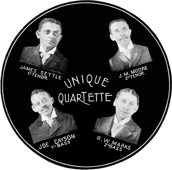 Quand vient le temps des enregistrements, les cylindres du phonographe sont d’abord bien plus répandus que les disques monofaces du gramophone. On doit les premiers enregistrements de musique à des compositeurs classiques et/ou lyriques : l’Anglais Arthur Sullivan en 1888, l’Allemand Johannes Brahms en 1889, les Russes Anton Rubinstein et Piotr Ilitch Tchaïkovski en 1890… Mais les Afro-Américains ne sont pas en reste. George Washington Johnson enregistre dès 1890, entre janvier en juin, et peut-être même bien avant, mais dans un registre un peu à l’écart de l’objet de ce site (1). À peu près au même moment, un duo de banjoïstes, les Bohee Brothers, et la Jubilee Coloured Concert Company of New York, seraient aussi passés en studio, mais si la réalité des sessions n’est pas remise en cause, nous n’avons aucune trace de ces enregistrements. En revanche, le 19 décembre 1890, le Unique Quartet devient bien le premier groupe de spirituals auteur de chansons (sur cylindres), réalisés pour la New York Phonograph Company (2). Ces enregistrements sont avérés et les chanteurs identifiés, même si on ne connaît ni leur nombre ni les titres des morceaux, là encore faute d’avoir retrouvé les cylindres.