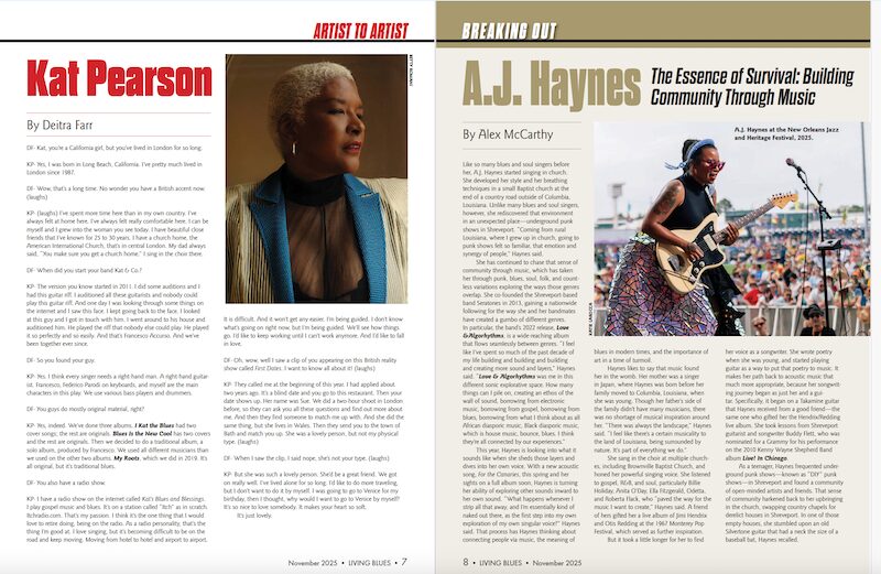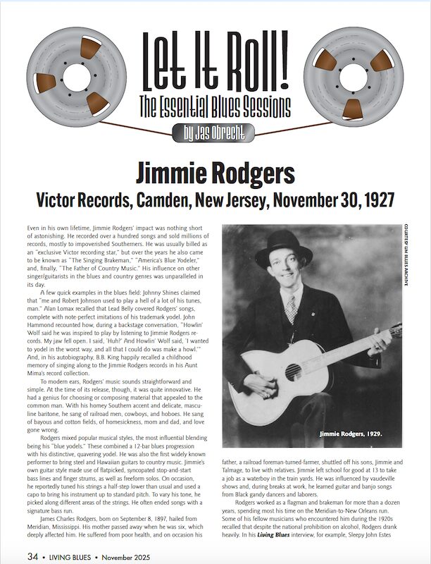 Bientôt trois cents numéros pour la revue américaine, mais attardons-nous sur ce numéro 299 de Living Blues, avec un sommaire toujours aussi alléchant. Bob Stroger apparaît en couverture et fait l’objet d’un long sujet de douze pages. Ce n’est que justice pour le chanteur-bassiste de quatre-vingt-quatorze ans, qui, au travers de son récent album « Bob Is Back! » (Delmark) que j’ai retenu dans mon Top 10 des disques de l’année, démontre qu’il reste très crédible artistiquement après soixante-dix ans de carrière. Moins connu, Wilson Meadows est un vétéran de la soul sudiste qui a débuté dans les années 1960, et Christopher Klug revient sur son parcours. La gent féminine est d’abord représentée par Jai Malano : originaire de Floride, cette chanteuse de blues et soul a vécu en Californie avant de se fixer à Austin, Texas. Puis viennent Kat Pearson, chanteuse de blues originaire de Californie installée à Londres, et A.J. Haynes, chanteuse, guitariste et fondatrice des Seratones à Shreveport en Louisiane, une formation de soul rock, qui, comme nombre de ses paires dans l’État du Pélican, sait s’ouvrir à différents styles. Christone « Kingfish » Ingram est également au sommaire le temps d’une interview. Enfin, la rubrique « Let it Roll » de Jas Obrecht s’arrête sur Jimmie Rodgers, dont l’œuvre enregistrée (1927-1933), certes basée sur la country, a également influencé le blues.