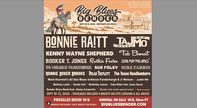 Vous le savez, j’annonce les programmes des festivals aux États-Unis en fonction de leur importance, de la qualité du plateau et si les informations sont connues suffisamment à l’avance pour vous laisser le temps d’envisager (et d’organiser !) le déplacement. C’est bien sûr le cas du « méga » festival Big Blues Bender, dont la prochaine édition se tiendra du 10 au 13 septembre 2026 à Las Vegas dans le Nevada. L’événement se passe sur quatre scènes du complexe démesuré (comme bien d’autres de la Sin City, il est vrai…) du Westgate Las Vegas Resort & Casino, où vous trouverez de quoi vous occuper quelles que soient vos aspirations et la durée de votre séjour. Je ne vous ferai d’ailleurs pas l’injure de vous suggérer des idées sur place… Passons donc à la programmation !