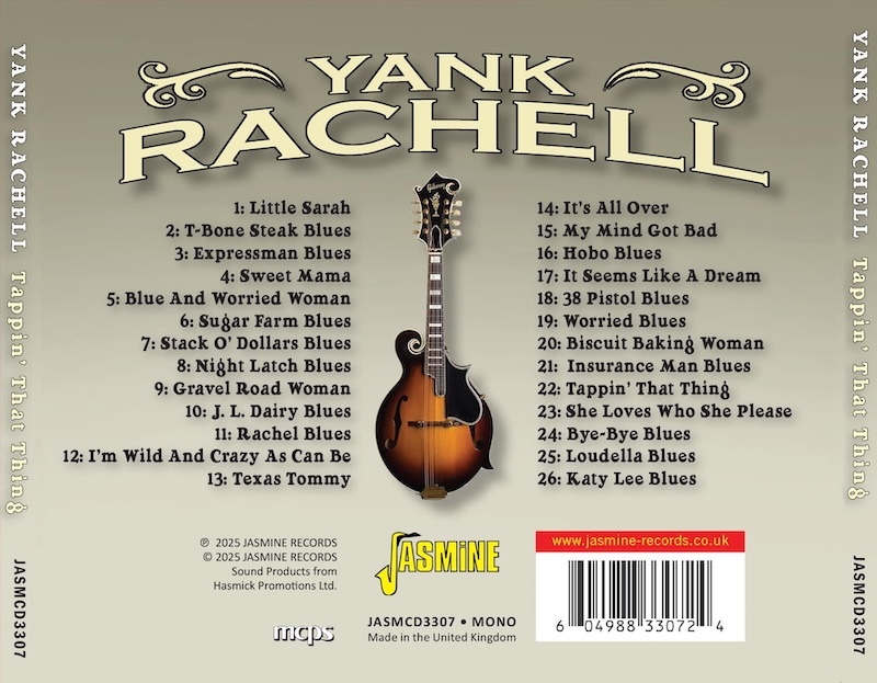 Jasmine Records a sorti ce 14 novembre 2025 une réédition consacrée à Yank Rachell, « Tappin’ That Thing, 1929-1941 », qui compte vingt-six chansons. James A. « Yank » Rachell (1903-1997) jouait de l’harmonica, du violon et de la guitare, mais il fut surtout un des plus brillants adeptes de la mandoline, un instrument assez peu répandu dans le blues. Originaire du Tennessee, il grandit dans la région de Brownsville et débute avec Hambone Willie Newbern. Il rencontre ensuite Sleepy John Estes dans le cadre d’une collaboration qui durera de longues années, et avec lequel il grave d’ailleurs ses premières faces en 1929 (les deux chansons qui ouvrent cette sélection sont créditées à Estes).