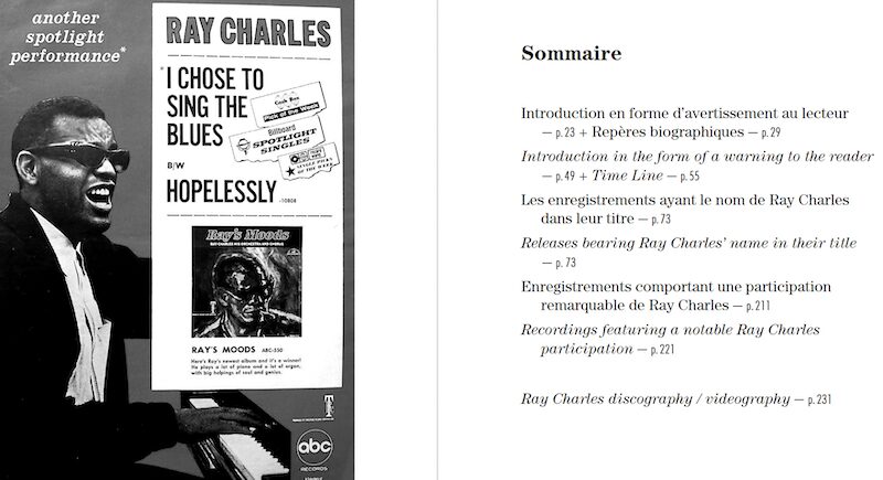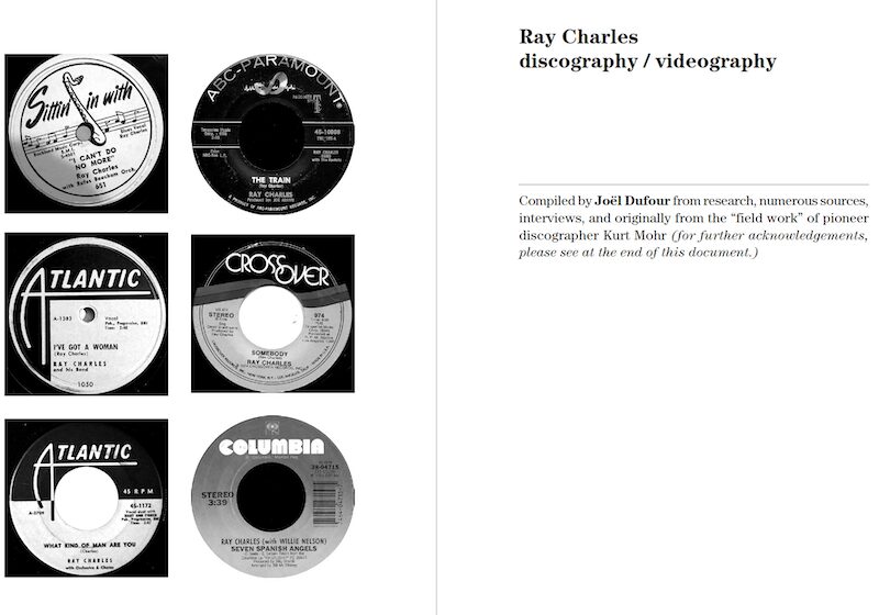 Suit une section « Repères biographiques », une chronologie qui reprend les grandes lignes de la vie et de la carrière du Genius. Vient ensuite un chapitre essentiel de plus de 130 pages intitulé « Les enregistrements ayant le nom de Ray Charles dans leur titre » : il s’agit tout simplement de toutes ses réalisations sous son nom et sur différents supports (78-tours, 33-tours, CD, DVD…) depuis ses débuts discographiques en 1949. Joël ne se contente pas d’en faire la liste, il les commente, les analyse, s’arrête sur les différentes chansons, sur la qualité sonore… La partie suivante, « Enregistrements comportant une participation remarquable de Ray Charles », porte sur les contributions notables du Genius auprès d’autres artistes, et nous savons combien elles sont nombreuses, depuis 1962 avec son label Tangerine inauguré par Percy Mayfield, jusqu’à sa participation en 2003 au film Piano Blues de Clint Eastwood dans le cadre de la série « Martin Scorsese Presents the Blues ».