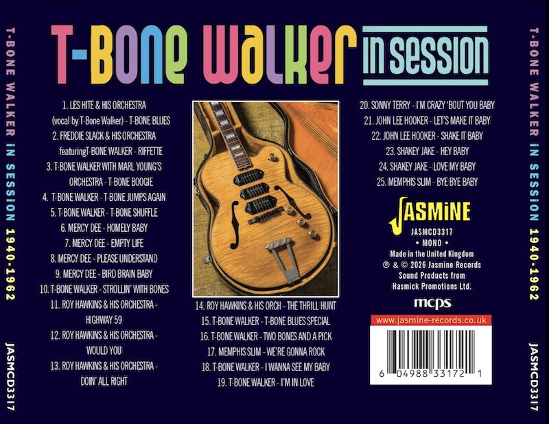 Sur son site Internet, le label anglais Jasmine Records nous rappelle qu’il a déjà consacré deux anthologies à T-Bone Walker, « Get These Blues off Me – As & Bs 1950-1955 » (2015) et « T-Bone Jumps Again – More Singles As & Bs – Includes all His Greatest Chart Hits, 1947-1950 » (2020). Jamais deux sans trois avec « In Session 1942-1962 », qui sortira le 9 janvier 2026. La période concernée est plus large, et la sélection porte sur des enregistrements moins connus. On retrouve ainsi l’incomparable chanteur-guitariste (mon article dans le numéro 258 de Soul Bag), impérial au sein des orchestres jazzy de Les Hite, Freddie Slack, Marl Young et Roy Hawkins, mais aussi dans des ambiances plus intimistes mais toujours ô combien convaincantes aux côtés d’autres bluesmen comme Mercy Dee, Memphis Slim, Sonny Terry, John Lee Hooker et Shakey Jake. L’album se précommande à cette adresse et j’ajoute deux extraits, T-Bone Boogie (1945) et Two Bones and a Pick (1957).