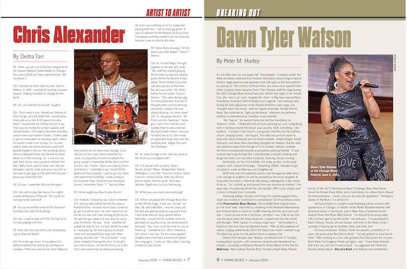 Mike Stephenson propose ensuite un article consacré à Lee Holloway, guitariste surtout connu pour ses collaborations avec d’autres artistes dont Johnny Drummer, Sheryl Youngblood, Joe Barr et Joe Pratt. Dans les rubriques récurrentes, Deitra Farr s’arrête sur le batteur Dave Alexander (qui a débuté sur Maxwell Street en 1982 !) et Peter M. Hurley sur la chanteuse canadienne Dawn Tyler Watson. Enfin, dans « Let it Roll », Jas Obrecht considère deux sessions qui mettent en scène Alberta Hunter et qui datent de décembre 1979 et de janvier 1980. Ceci n’est pas banal car Hunter, née en 1895, tourna en France dès 1917 (trois ans avant l’enregistrement du premier disque de blues !) et devint une des plus notables chanteuses du Classic Blues des années 1920, avant donc de faire un étonnant (et probant) come-back à quatre-vingt-cinq ans !