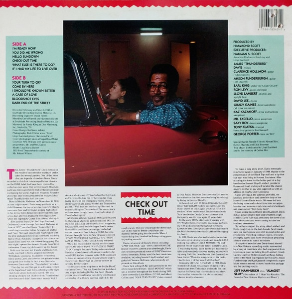 On perd ainsi sa trace au point de le croire mort… Mais en 1988, Hammond Scott, un des fondateurs sept ans plus tôt du label Black Top Records, le retrouve à Houma, au sud de la Louisiane, et le convainc de reprendre sa carrière. En février et mars 1989, il entre en studio pour enregistrer ce qui deviendra son unique album, « Check Out Time », sur lequel il bénéficie d’un accompagnement royal, avec notamment ses vieux compagnons de route Clarence Hollimon et Lloyd Lambert, aux côtés d’Anson Funderburgh (g), Ron Levy (kbds), Grady Gaines et Kaz Kazanoff (sax). Davis chante magnifiquement, d’une voix soulful hyper expressive nourrie au gospel, et le disque est plébiscité. Deux mois plus tard, il chante sur l’album « Healing Feeling » de Hubert Sumlin, toujours pour Black Top, et tout laisse alors penser que James « Thunderbird » Davis va pouvoir mener une carrière à la hauteur de son talent. Hélas, le sort en décide autrement, et le 24 janvier 1992, alors qu’il préparait un nouvel album, il s’effondre et décède sur scène en plein milieu d’un concert au Blues Saloon à Saint Paul, Minnesota.